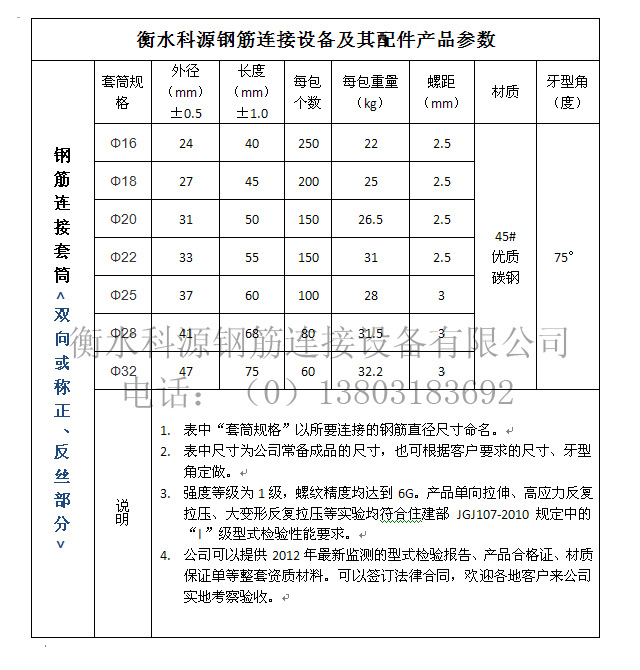 鋼筋剝肋滾軋直螺紋連接,就是將待連接鋼筋端部的縱肋和橫肋用切削的方法剝掉一部分,然后直接滾軋成普通直螺紋,用特制的直螺紋套筒連接起來,形成鋼筋的連接。鋼筋連接套筒特點1、使用鋼筋連接套筒可以降低材料的使用,而且操作簡便,不受鋼筋成份種類限制。2、鋼筋連接套筒可提前預制,不占工期,加工效率高。3、連接方便、快捷、簡單,施工不用電,風雨無阻,可全天候施工。4、可連接橫、豎、斜向的HRB335、HRB400、HRB500同徑或異徑鋼筋。服務(wù)方式 1、提供φ16-φ40mm規(guī)格鋼筋的直螺紋連接套筒2、提供鋼筋直螺紋加工設(shè)備3、負責施工現(xiàn)場技術(shù)培訓及設(shè)備維修服務(wù)。直螺鋼筋連接套筒規(guī)格型號如下: φ16-φ40普通鋼筋連接套筒、異徑鋼筋連接套筒、可調(diào)鋼筋連接套筒、特殊型鋼筋連接套筒。