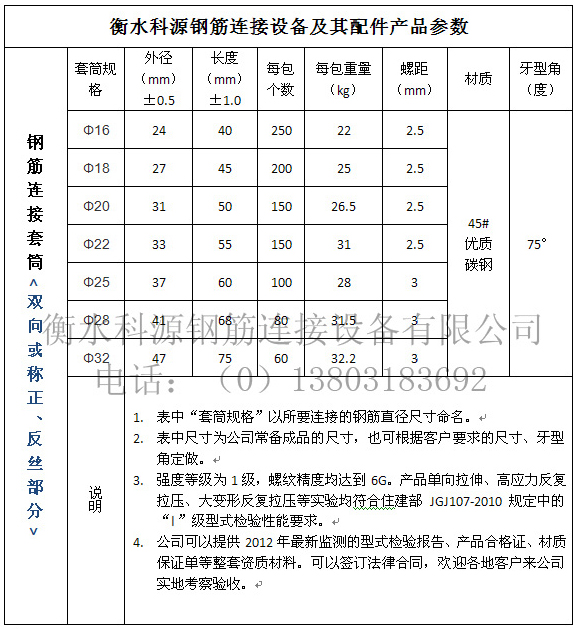 鋼筋剝肋滾軋直螺紋連接,就是將待連接鋼筋端部的縱肋和橫肋用切削的方法剝掉一部分,然后直接滾軋成普通直螺紋,用特制的直螺紋套筒連接起來,形成鋼筋的連接。鋼筋連接套筒特點(diǎn)1、使用鋼筋連接套筒可以降低材料的使用,而且操作簡便,不受鋼筋成份種類限制。2、鋼筋連接套筒可提前預(yù)制,不占工期,加工效率高。3、連接方便、快捷、簡單,施工不用電,風(fēng)雨無阻,可全天候施工。4、可連接橫、豎、斜向的HRB335、HRB400、HRB500同徑或異徑鋼筋。服務(wù)方式 1、提供φ16-φ40mm規(guī)格鋼筋的直螺紋連接套筒2、提供鋼筋直螺紋加工設(shè)備3、負(fù)責(zé)施工現(xiàn)場技術(shù)培訓(xùn)及設(shè)備維修服務(wù)。直螺鋼筋連接套筒規(guī)格型號如下: φ16-φ40普通鋼筋連接套筒、異徑鋼筋連接套筒、可調(diào)鋼筋連接套筒、特殊型鋼筋連接套筒。