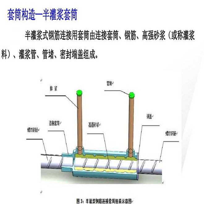 二、適用范圍:其適用性廣,是目前使用廣泛的一類套筒灌漿接頭形式。一般用于預制框架梁主筋的連接。全灌漿連接目前可連接 HRB335 和 HRB400 帶肋鋼筋,連接鋼筋直徑范圍為φ16mm~φ40mm。