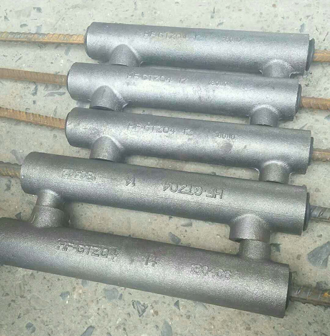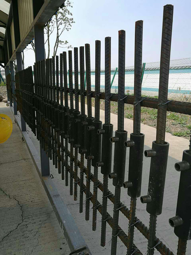 3、套筒就位:吊裝后,+檢查兩側構件伸出的待連接鋼筋對正,偏差不得大于±5mm;且兩鋼筋相距間隙不得大于+30mm。將套筒按標記移至兩對接鋼筋中間。
